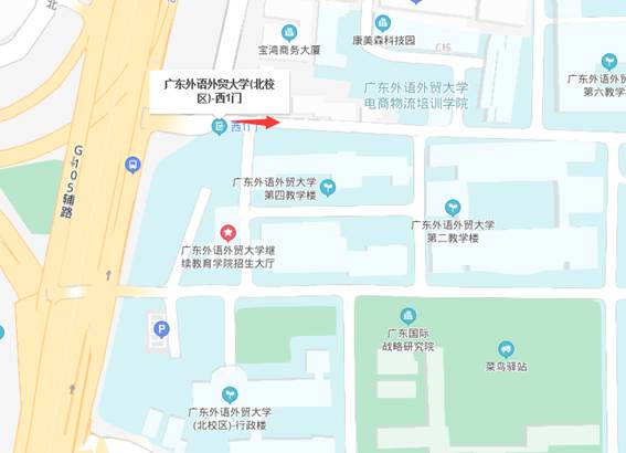 白云山校区:从白云大道北2号广东外语外贸大学(北校区)-西1门(见下图所示)进入,按照现场指引到达考场。考试结束后各考生要尽快离开考场,不要逗留。