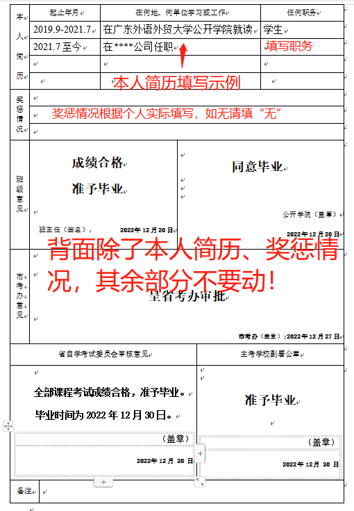 使用本通知附件1《毕业生登记表背面(公开学院)》(WORD文件),在表中如实填写个人简历和奖惩情况,如下图;